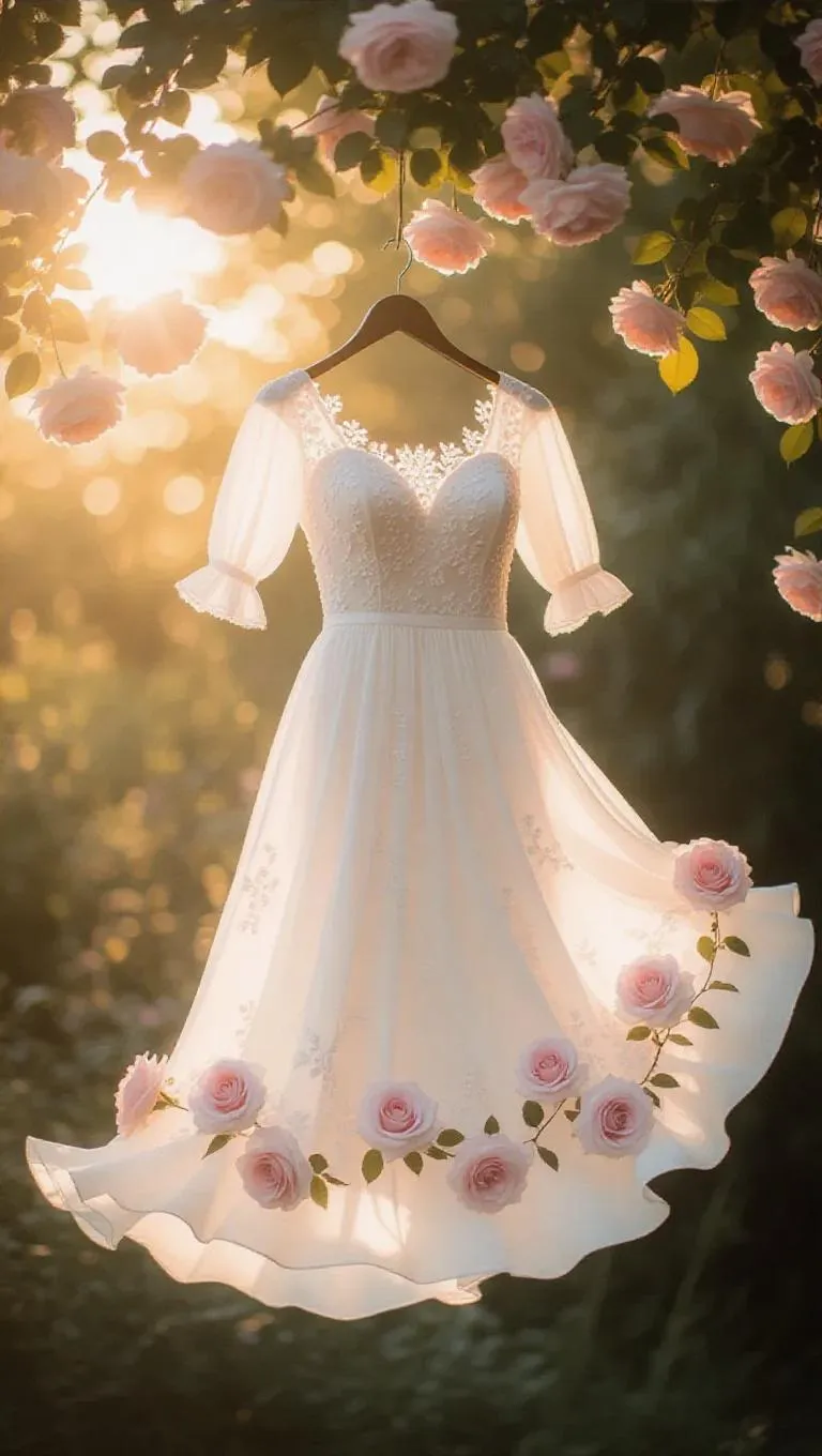 A flowing white dress with delicate pinkroses blossoming along the hem and sleeves, creating a whimsical blend of elegance and natural beauty. The dress sways gently in the breeze, surrounded by soft, diffused sunlight filtering through leaves, enhancing the serene and magical atmosphere.