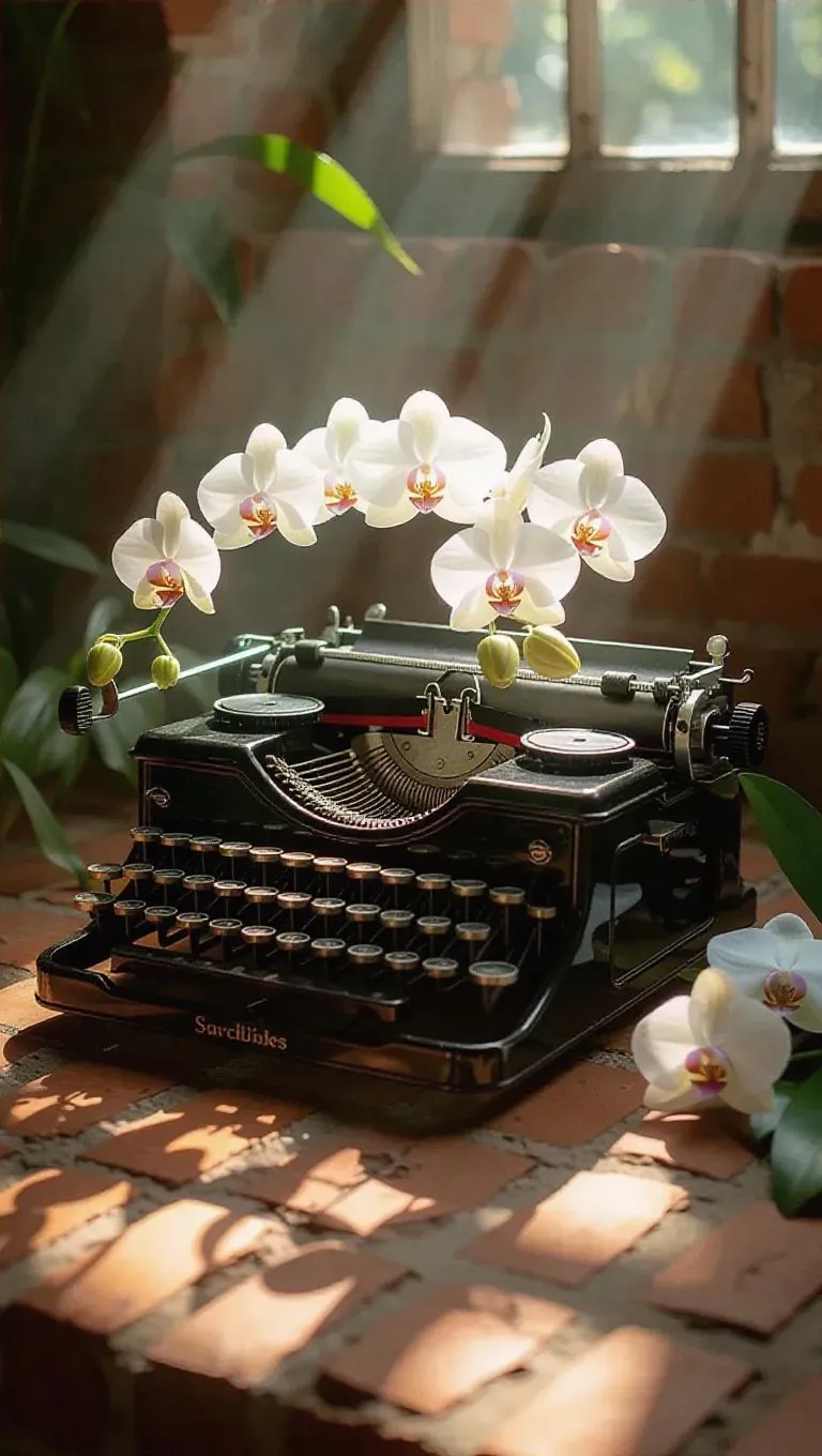 An antique typewriter with mystical orchids flowering from the keys and carriage, creating an exquisite blend of vintage charm and natural beauty. The typewriter is located on a textured brick surface, surrounded by subtle, warm rays of sunlight seeping through foliage, enhancing the tranquil and dreamy atmosphere.