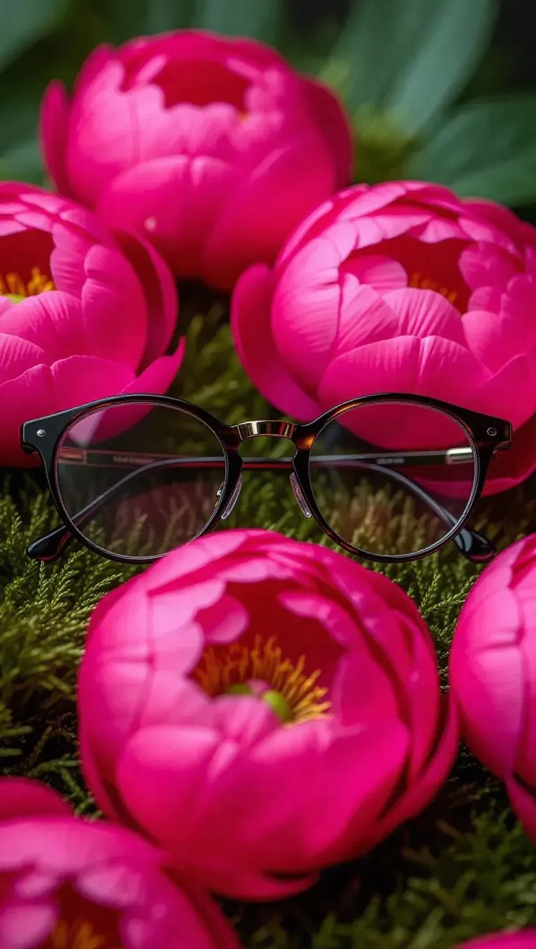 A broken pair of reading glasses, the cracks overflowing with lavish peonies and emerald moss