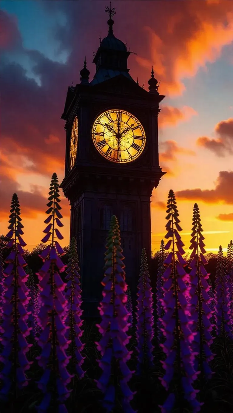 A grand, cracked clock tower, glowing richly with a sunset glow from its fractured face, entwined with elegant foxgloves that rise around it and burst at its foot, creating a magical, enchanting ambiance.