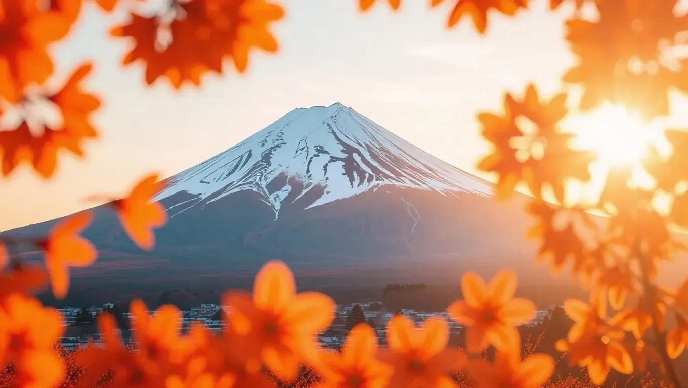 An artistic close-up of Mount Fuji, its snow-capped peak adorned with a cascade of bright orange flowers. The iconic mountain shape remains, but the summit is now a warm, floral haven. Dappled sunlight filters through the petals, casting an inviting, cheerful glow. The atmosphere is joyful and uplifting, with vibrant colors enhancing the happy, symbolic blend of nature and celebration.