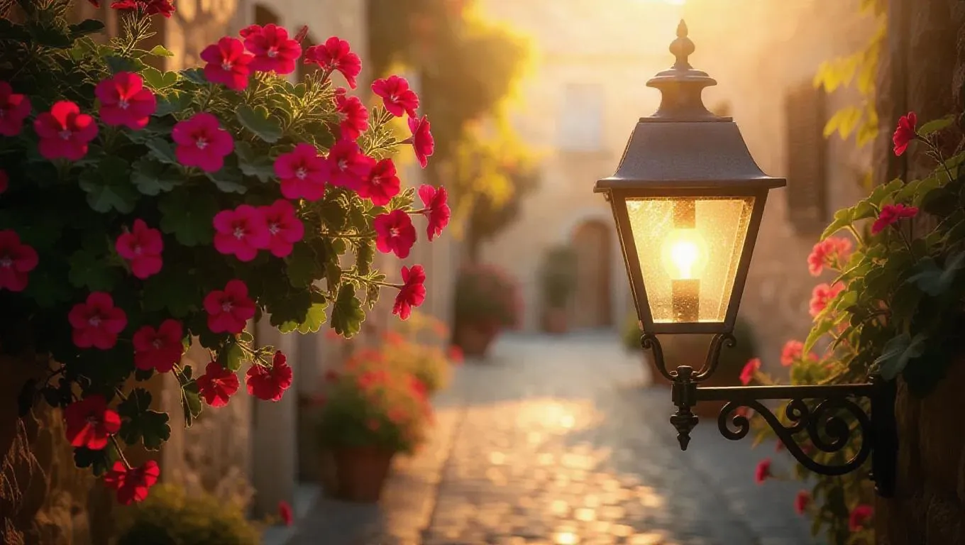 An ancient cobblestone streetlamp, glowing with a soft golden light, intertwined with clusters of bright geraniums that dance in the soft breeze, painting a summer's day vibe