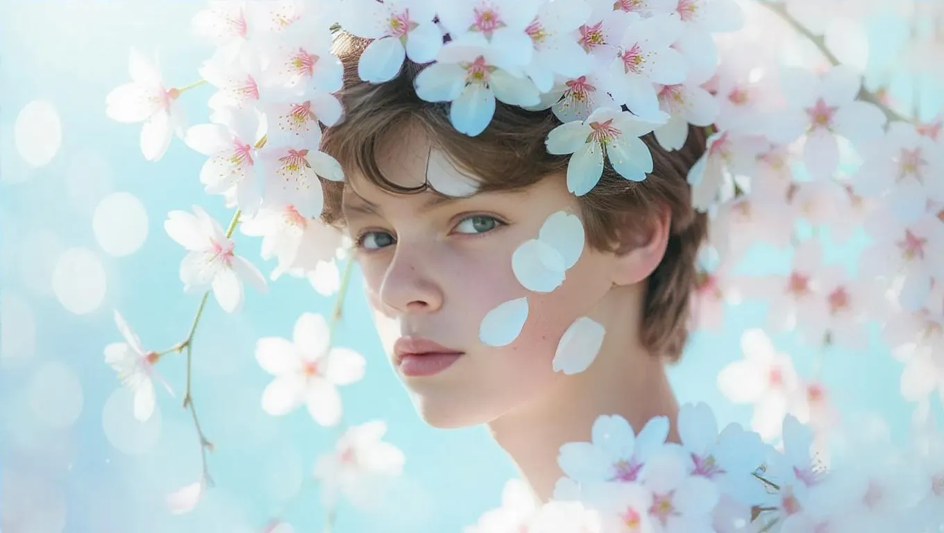 A serene portrait of a teenage boy crafted from delicate petals, enveloped in a radiant halo of pale blue and lovely pink blossoms, set against a charming, soft backdrop with gentle light, enhancing the dreamlike and beautiful.
