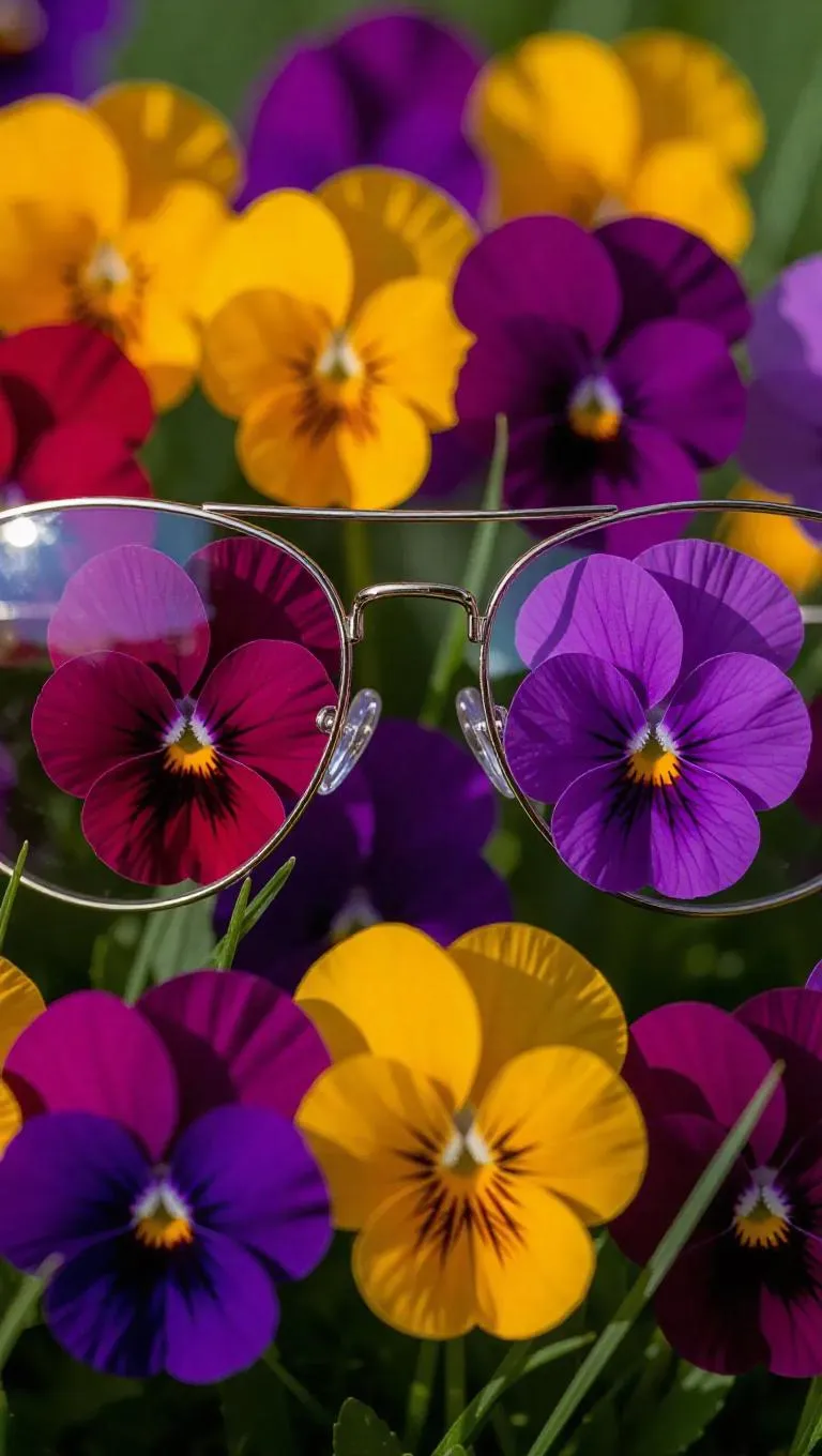An elegant pair of eyeglasses, the breaks filled with cheerful pansies and fresh grass