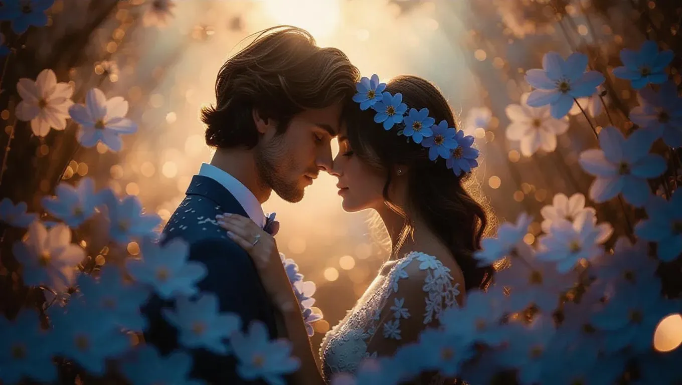 A romantic portrait of a couple crafted from delicate petals, enveloped in a radiant halo of creamy and deep blue blossoms, set against a whimsical, enchanted backdrop with gentle, twinkling light, enhancing the loving and tender connection.
