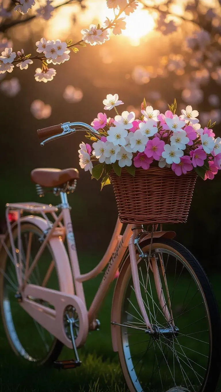 A vintage-style bicycle adorned with pink and white blossoms that seem to be gently touched by the breath of spring. The bike’s frame is elegantly designed, with a wicker basket at the front filled with fresh, vibrant flowers in shades of pink, white, and lavender. The wheels gleam in the soft evening sunlight, reflecting the surrounding beauty. The blossoms cascade gracefully from the handlebars and frame, creating a romantic and dreamy atmosphere. The scene is set against a soft, blurred background of a cozy garden, enhancing the focus on the bicycle and its floral adornments. The entire composition exudes warmth and nostalgia, as if the bicycle is carrying a load of springtime magic to a distant, idyllic destination. The art style is highly detailed and whimsical, capturing the textures of the flowers, the shiny metal of the bike, and the enchanting essence of the moment.