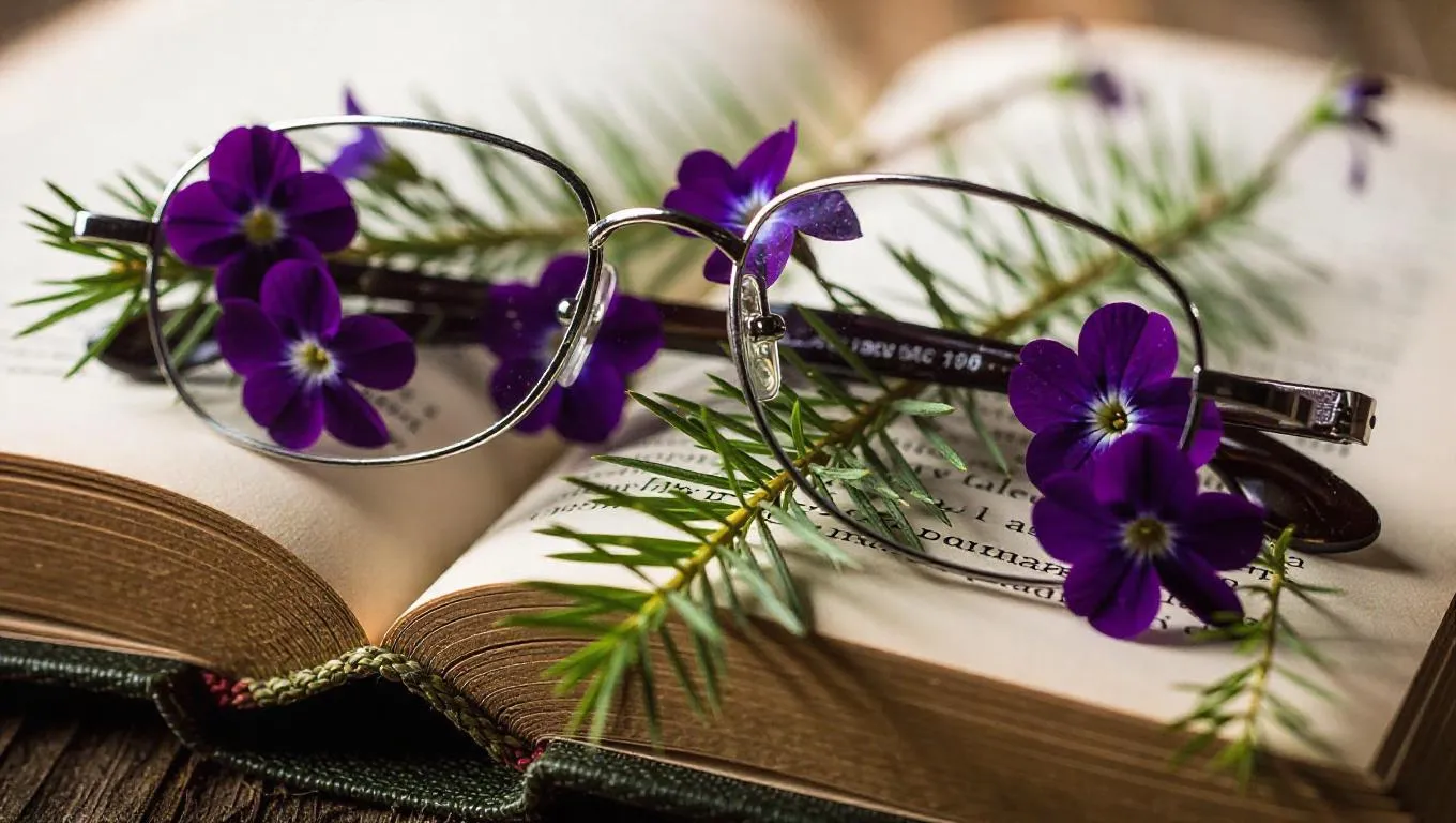 A vintage pair of reading glasses, the broken edges overflowing with wild violets and fresh pine needles