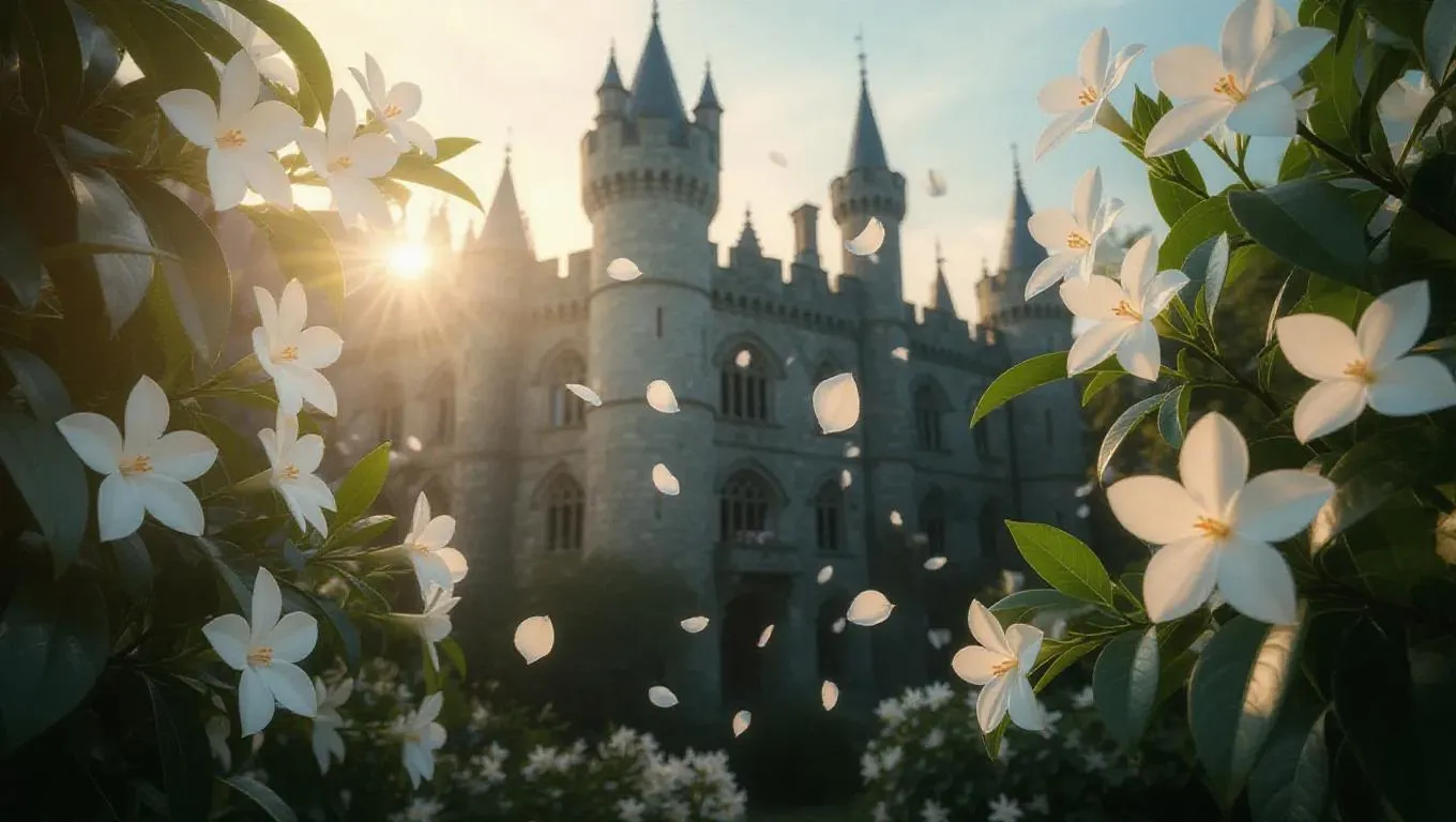 An antique castle, its glass shattered, with delicate jasmine petals floating out, time frozen in eternal bloom, surrounded by a soft, ethereal glow, capturing the moment of timeless beauty and fragility in a fragrant jasmine garden.
