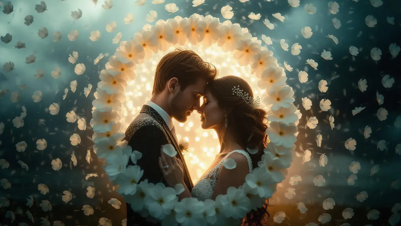 A romantic portrait of a couple crafted from delicate petals, enveloped in a radiant halo of white and yellow blossoms, set against a stormy, dark backdrop with intense, dramatic light, enhancing the loving and tender connection.