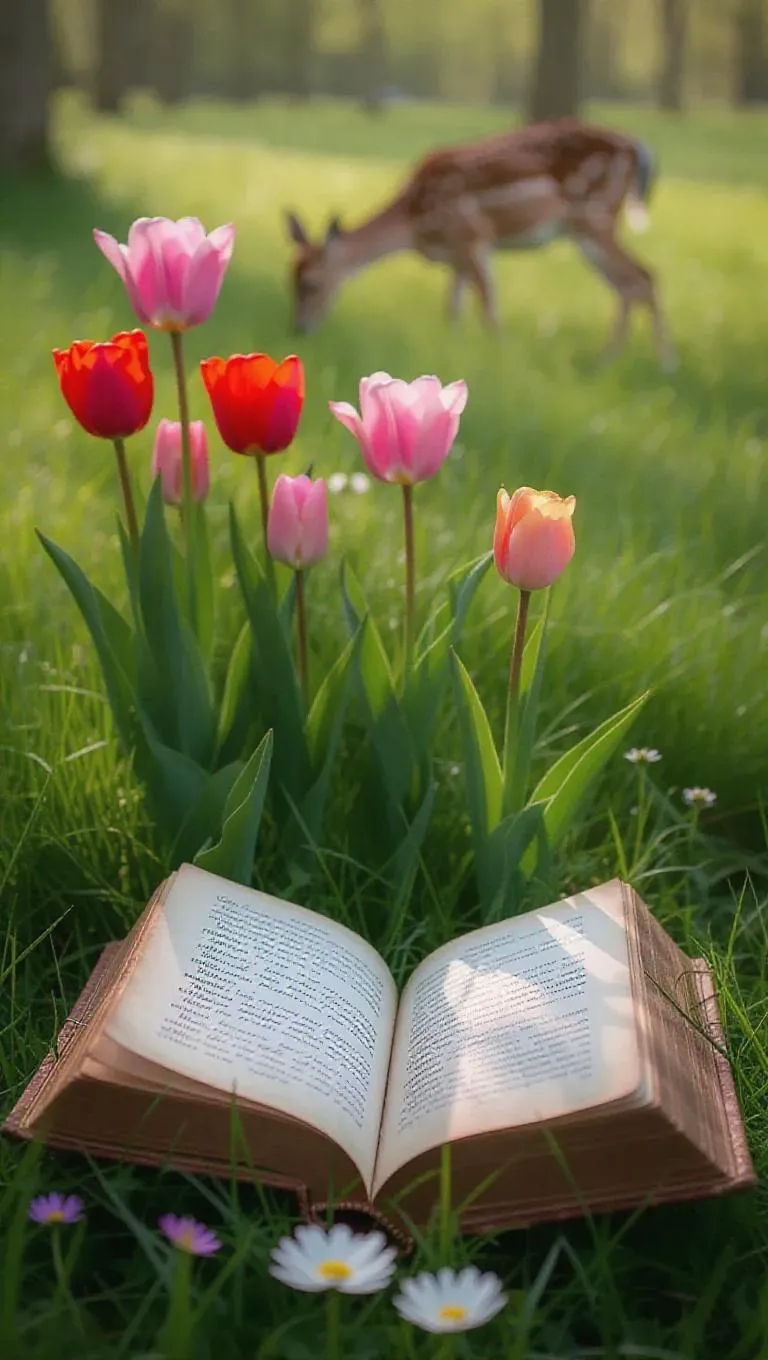 An ancient, weathered manuscript left open in a verdant meadow, with vibrant tulips blooming from its pages, delicate petals dancing in the gentle breeze, surrounded by lush green grass and wildflowers, and a graceful deer grazing in the distance.