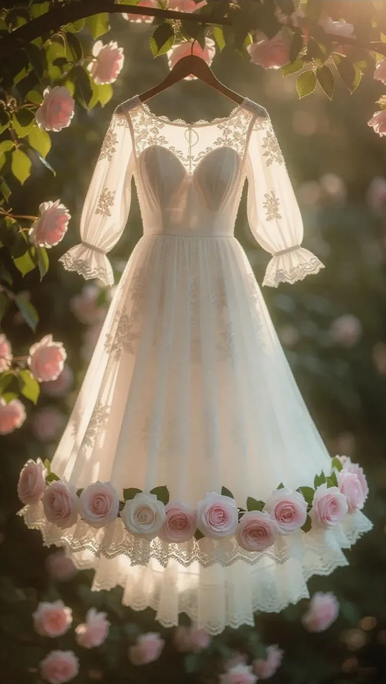 A flowing white dress with delicate pinkroses blossoming along the hem and sleeves, creating a whimsical blend of elegance and vintage charm. The dress sways gently in the breeze, surrounded by soft, vintage sunlight filtering through leaves, enhancing the serene and magical atmosphere.