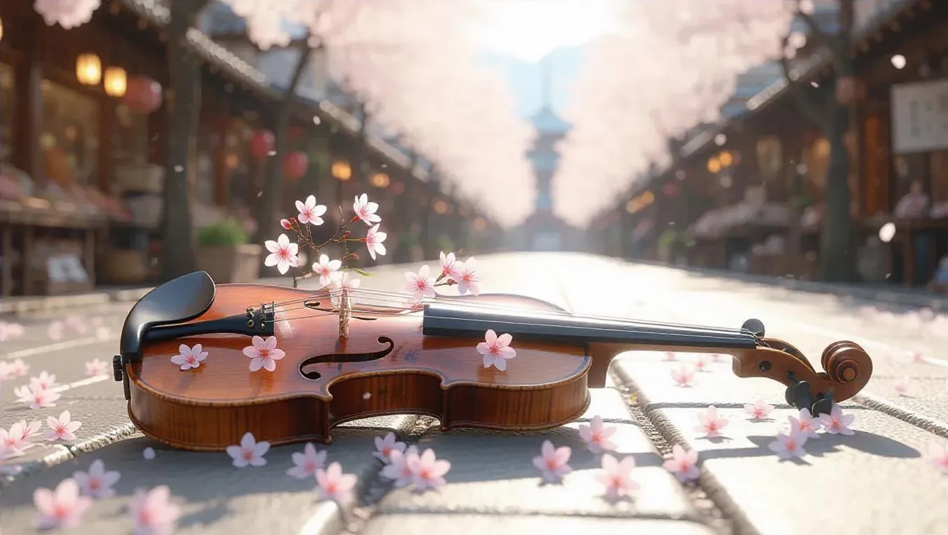 A weathered violin lying in a bustling marketplace, its wooden body cracked open, with delicate cherry blossoms sprouting from within, petals gently fluttering in the breeze, creating a surreal and enchanting scene