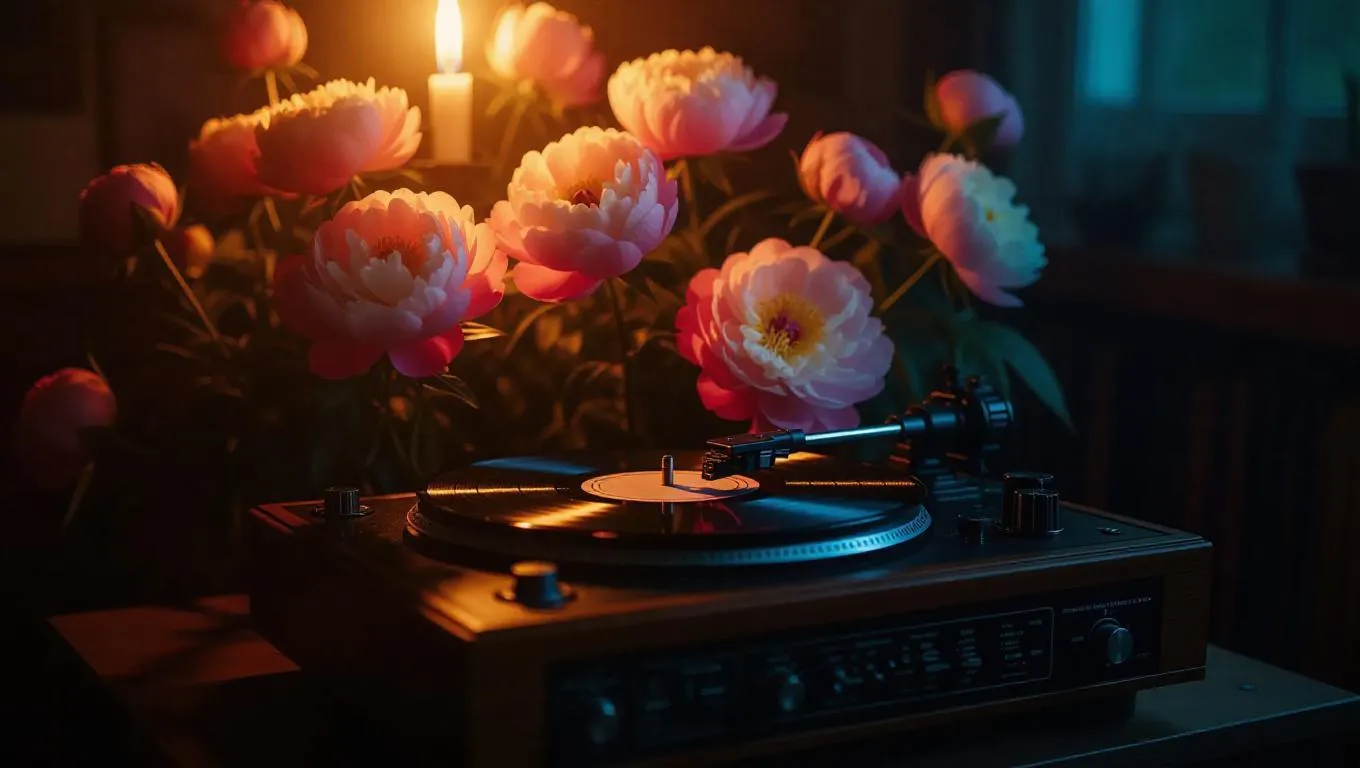 An antique vinyl record player adorned with bright peonies sprouting from its speakers, playing soft tunes in a dimly lit room, casting a warm, inviting glow