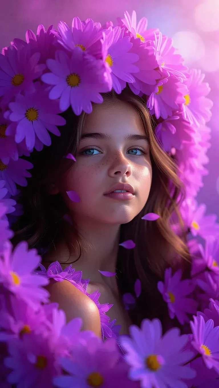 A serene portrait of a teenage girl crafted from delicate petals, enveloped in a radiant halo of soft purple and bright yellow blossoms, set against a dreamy, pastel backdrop with ethereal light, enhancing the mystical and enchanting.