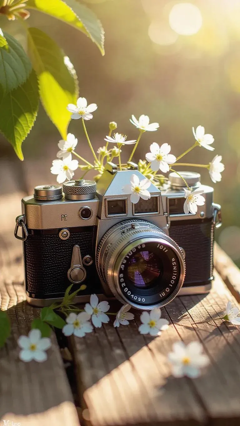 An antique camera with delicate, tiny flowers blossoming from the lens and shutter buttons, creating a whimsical blend of vintage charm and natural beauty. The camera rests on a rustic wooden surface, surrounded by soft, diffused sunlight filtering through leaves, enhancing the serene and magical atmosphere.