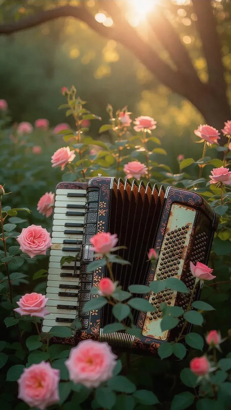 A weathered accordion in a tranquil garden, keys missing and engulfed by blooming roses, creating a surreal blend of decay and renewal, with dappled sunlight filtering through tree branches, casting playful designs on the ivories and petals.