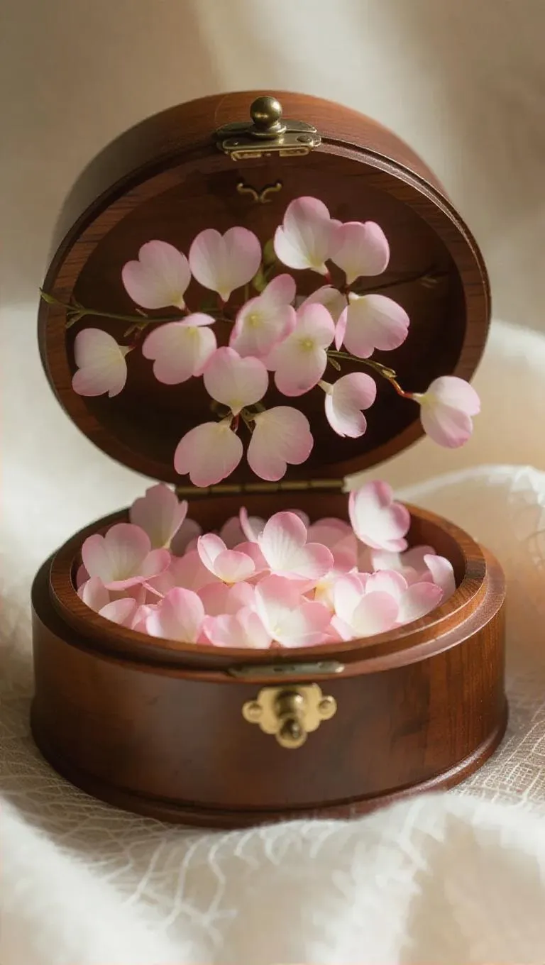 A wooden music box cracked open, but instead of water, silky petals cascade gently from within, symbolizing the delicacy of flowers and the beauty of life, the smooth blossoms flowing out, creating a serene and elegant scene of grace.