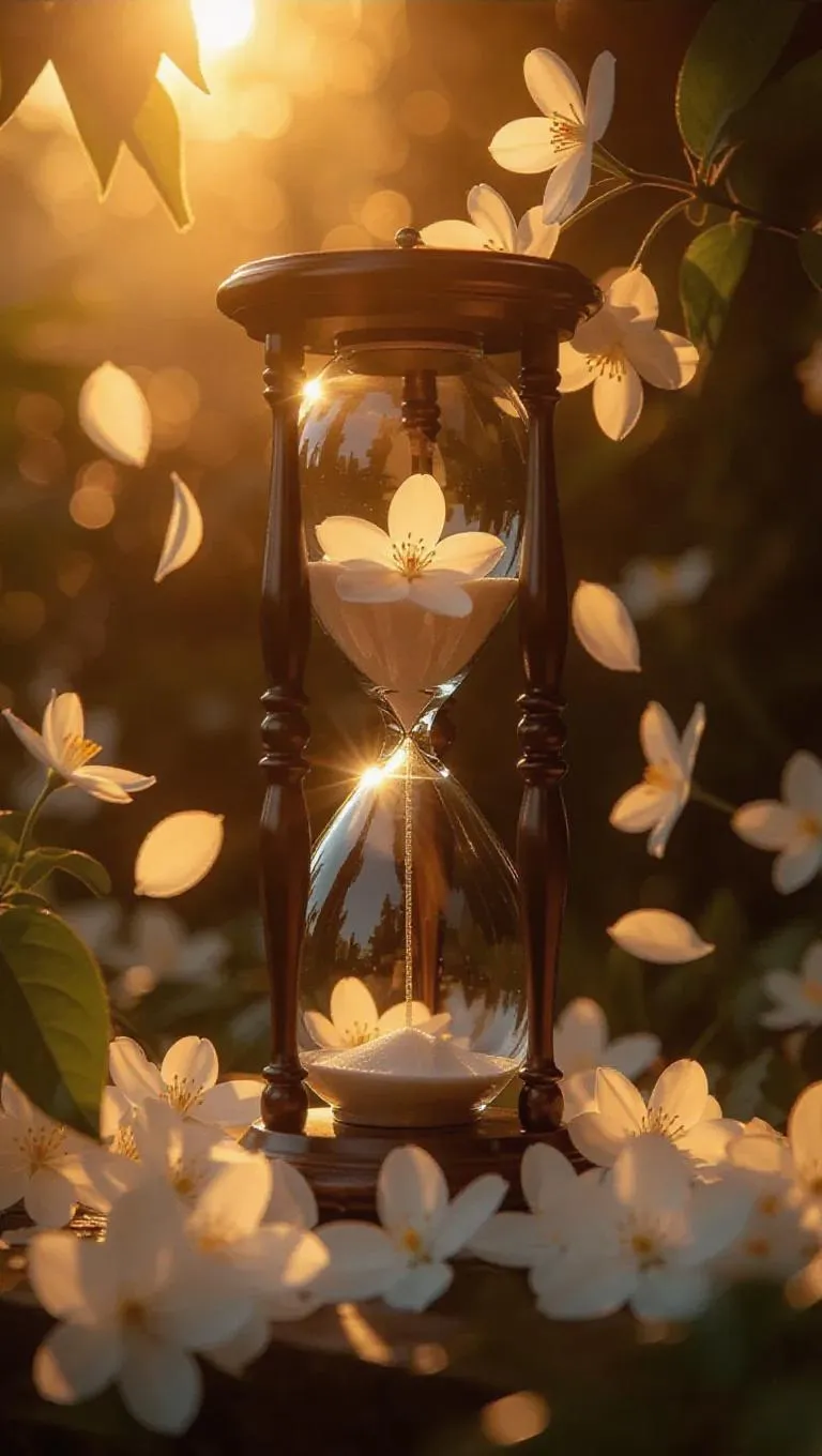 An elaborate hourglass, its glass completely intact, with soft jasmine petals cascading down, time flowing gently in a dreamlike state, surrounded by a warm, dreamy light, capturing the moment of serene beauty and tenderness in an enchanted garden.