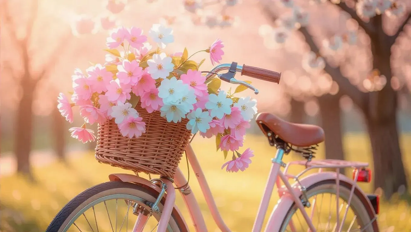 A vintage-style bicycle adorned with pink and white blossoms that seem to be gently touched by the breath of spring. The bike’s frame is delicately designed, with a wicker basket at the front filled with fresh, vibrant flowers in shades of pink, white, and light blue. The wheels gleam in the soft afternoon sunlight, reflecting the surrounding beauty. The blossoms cascade gracefully from the handlebars and frame, creating a romantic and dreamy atmosphere. The scene is set against a soft, blurred background of cherry blossom trees, enhancing the focus on the bicycle and its floral adornments. The entire composition exudes warmth and nostalgia, as if the bicycle is carrying a load of springtime magic to a distant, idyllic destination. The art style is highly detailed and whimsical, capturing the textures of the flowers, the glossy sheen of the bike, and the enchanting essence of the moment.