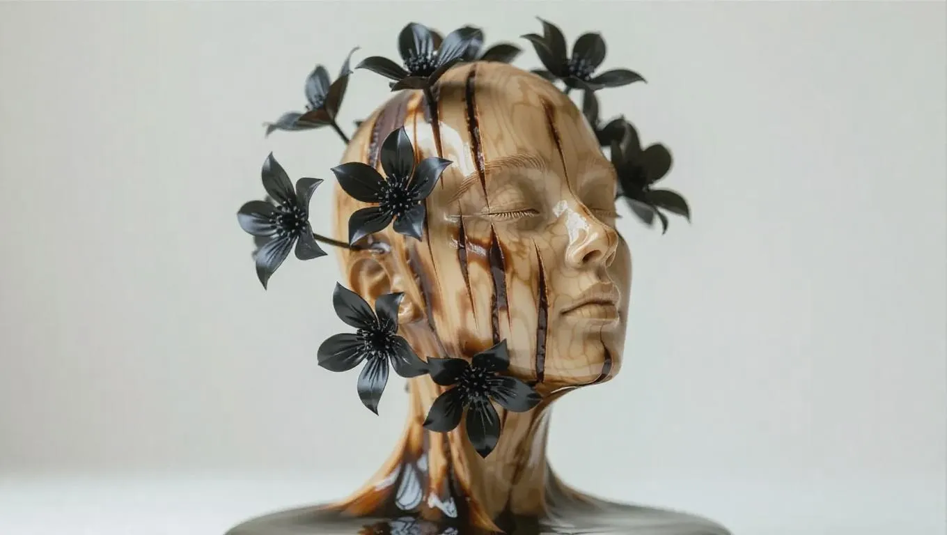 A melted wooden figurine with black flowers emerging from the cooled surface, symbolizing rebirth and renewal, the delicate petals contrasting with the hardened wood, creating a serene and poetic scene of life after destruction.