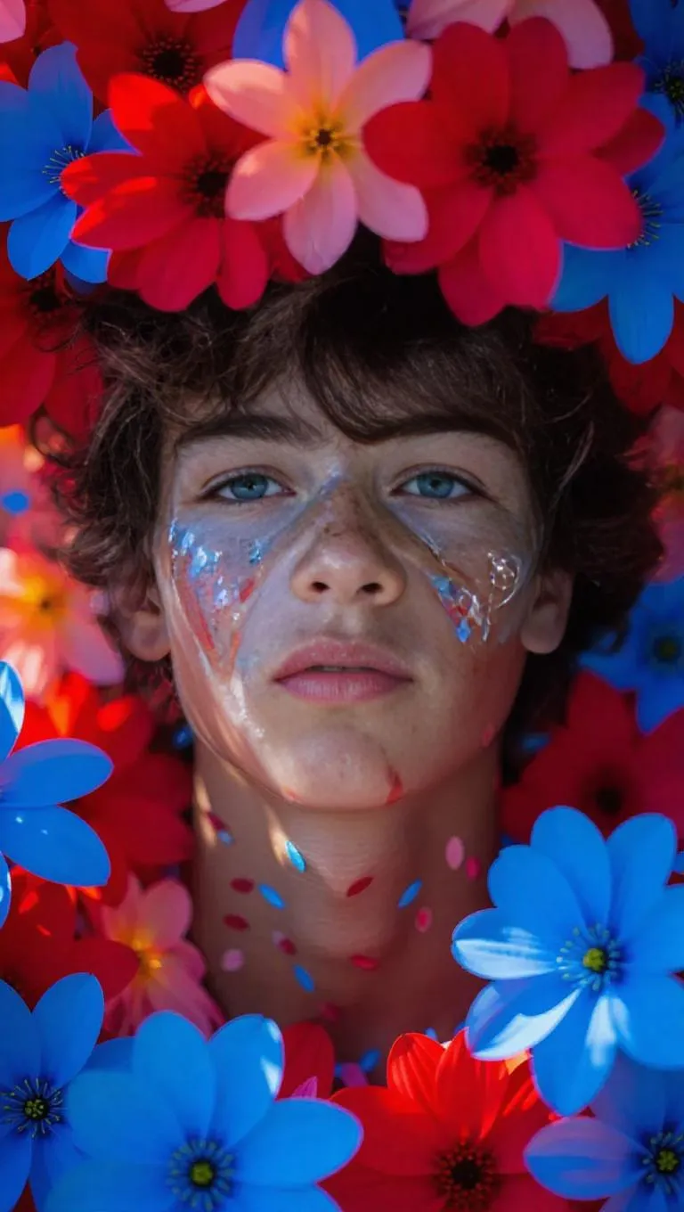 A serene portrait of a teenage boy crafted from delicate petals, enveloped in a radiant halo of bright crimson and soft azure blossoms, set against a lively, exotic backdrop with vivid light, enhancing the spirited and enchanting.