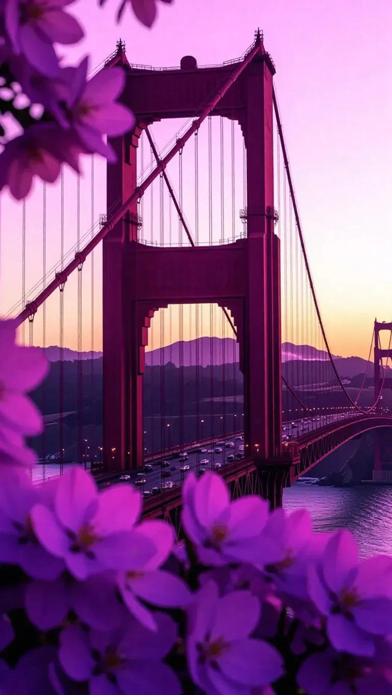 An artistic close-up of the Golden Gate Bridge, its towering arches transformed into a delicate sea of soft purple blossoms. The iconic bridge shape remains, but the towers are now a lively, floral haven. Golden dawn sunlight gently illuminates the petals, casting a warm, enchanting glow. The atmosphere is serene and picturesque, with pastel clouds enhancing the tranquil, symbolic blend of nature and connection.