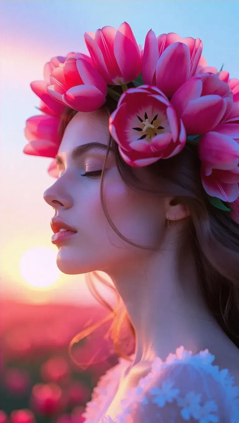 A serene portrait of a woman crafted from delicate petals, enveloped in a radiant halo of red and soft tulips, set against a dreamy, sunset backdrop with ethereal light, enhancing the mystical and enchanting