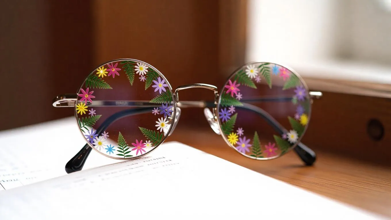 A delicate pair of reading glasses, the shards adorned with colorful daisies and entwined ferns
