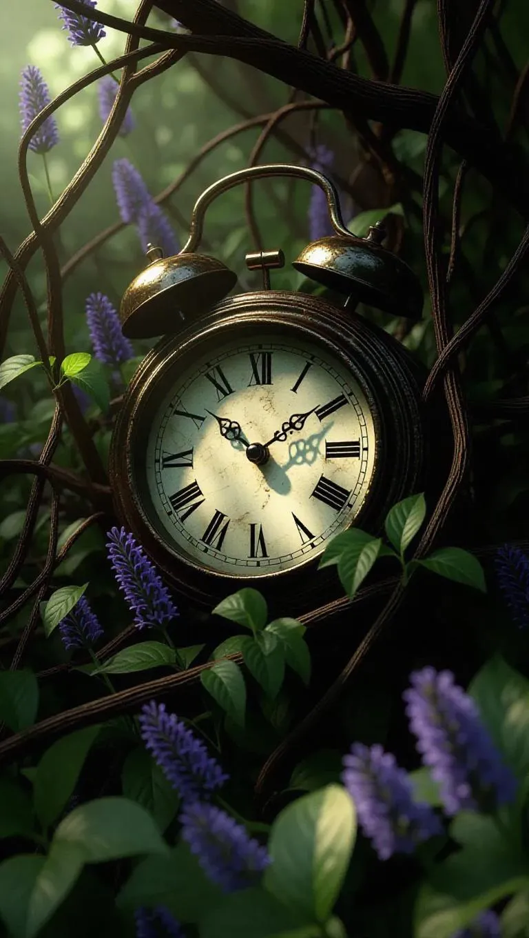 An old clock shattered and concealed in the green thicket, its eyes glowing gently, flourishing with lavender blooms, encased by twisted branches and dappled light falling from above.