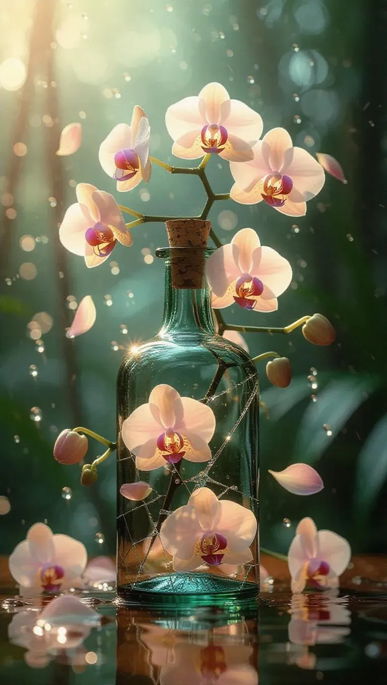 An antique bottle, its glass shattered, with delicate orchid petals floating out, time frozen in eternal bloom, surrounded by a soft, ethereal glow, capturing the moment of timeless beauty and fragility in a tropical rainforest.