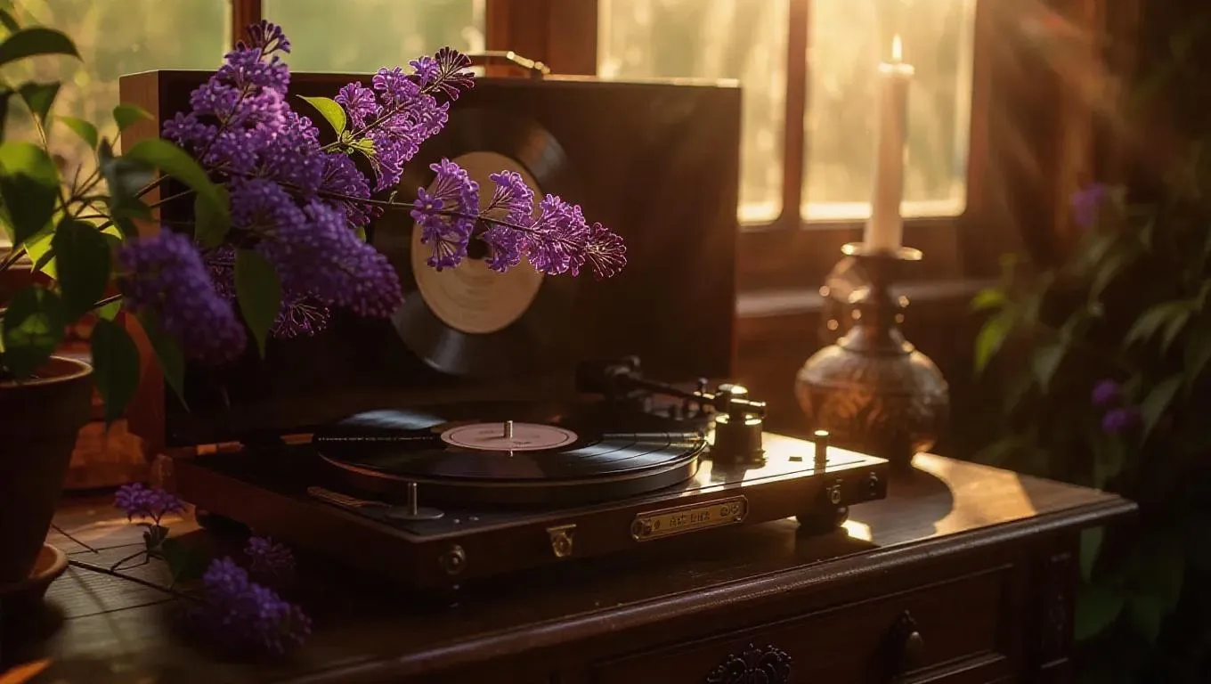 An antique vinyl record player adorned with elegant lilacs sprouting from its speakers, playing vibrant music in a sunlit room, casting a dreamy, whimsical glow