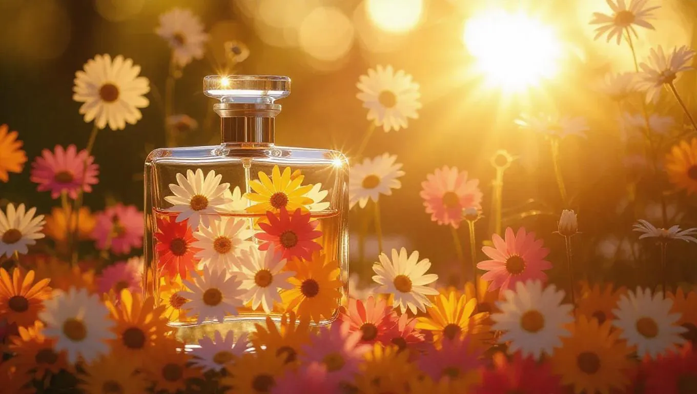 A classic flask, its glass intact, with colorful daisy petals swirling around, time held in unbroken autumn, encircled by a bright, shimmering light, illustrating the moment of fleeting charm and elegance in a sunlit glade.