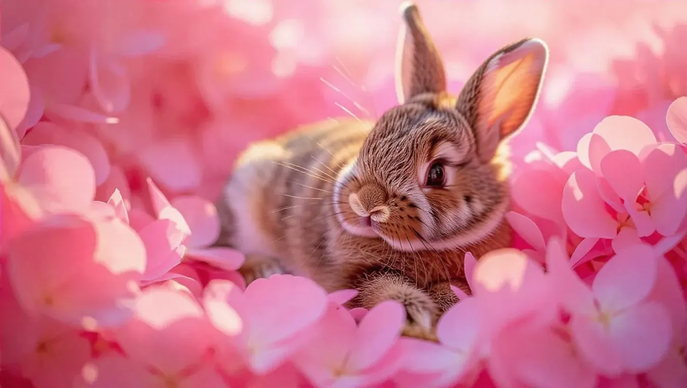 white charming petals softly blanket a fully detailed plush bunny, creating a whimsical and enchanting scene. Soft petals surround the bunny, adding a touch of magic and fairy tale charm.