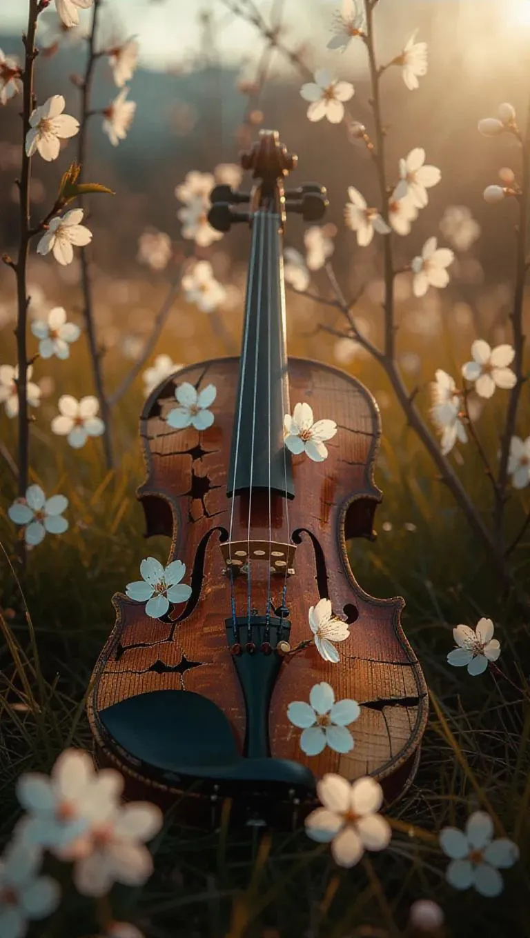 A weathered violin lying in a sunlit meadow, its wooden body cracked open, with delicate cherry blossoms sprouting from within, petals gently fluttering in the breeze, creating a surreal and enchanting scene.