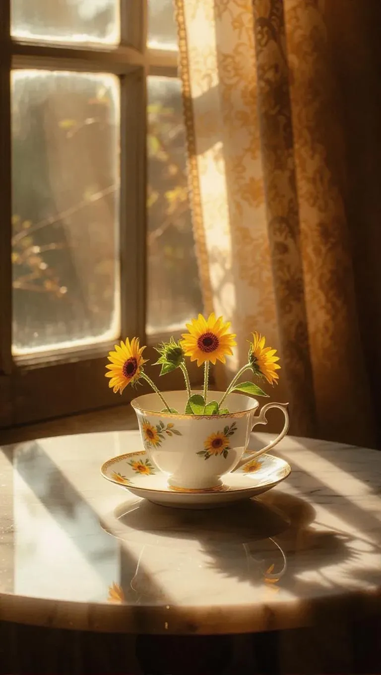 A delicate porcelain teacup featuring small sunflowers sprouting from its rim and handle, carefully placed on a vintage marble table beside the window, enveloped in warm, amber sunlight streaming through gauzy curtains