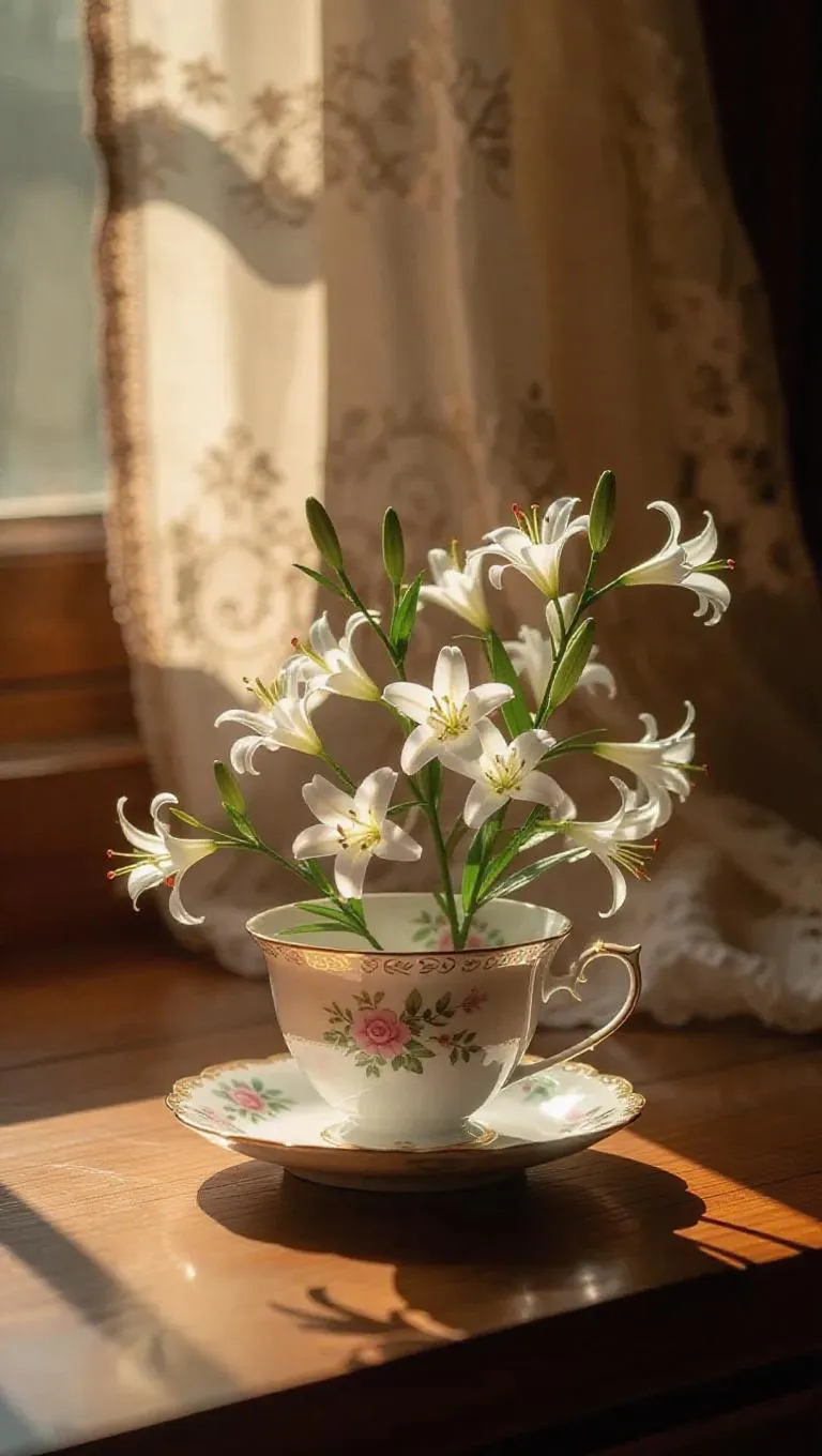 A classic porcelain teacup embellished with tiny butterfly lilies bursting from its rim and handle, resting calmly on a wooden desk near the window, illuminated by soft, golden rays filtering through light curtains