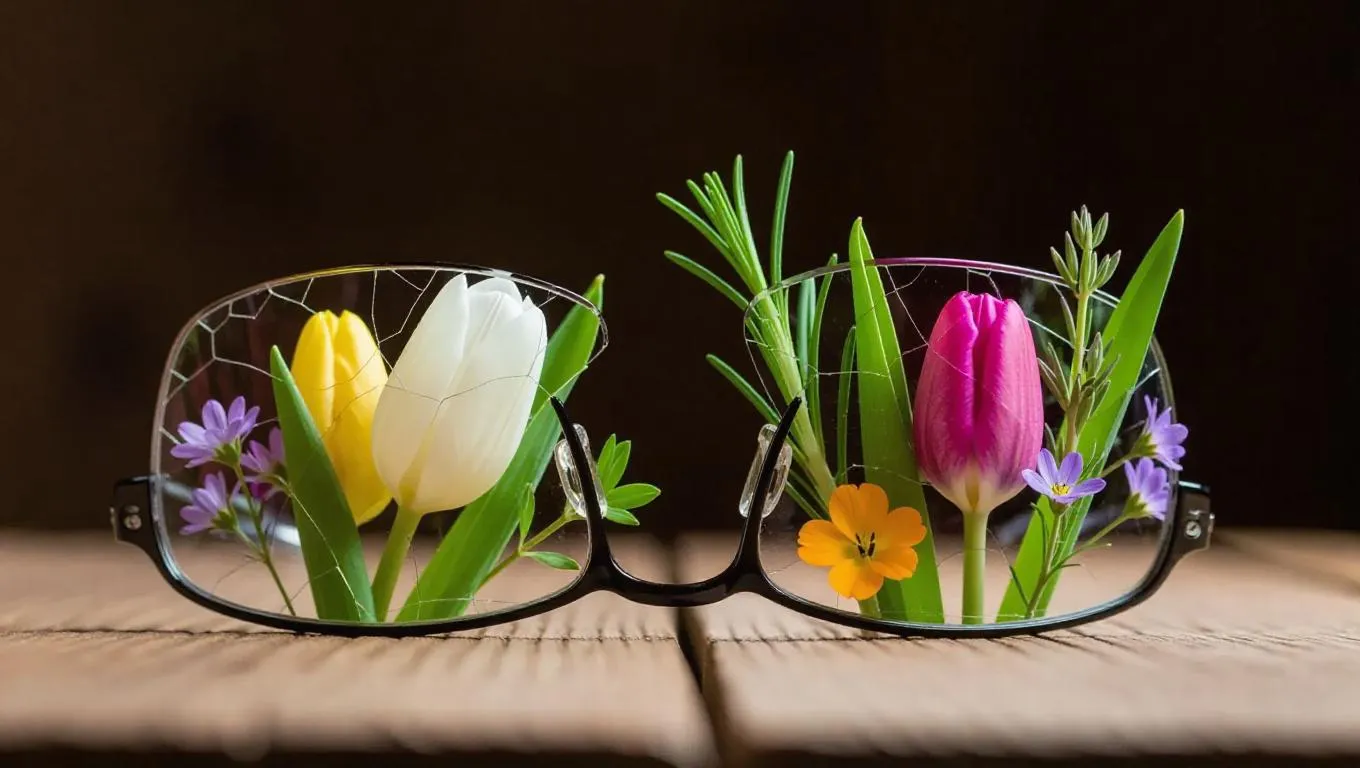 A broken pair of eyeglasses, the cracks filled with blooming tulips and fragrant herbs