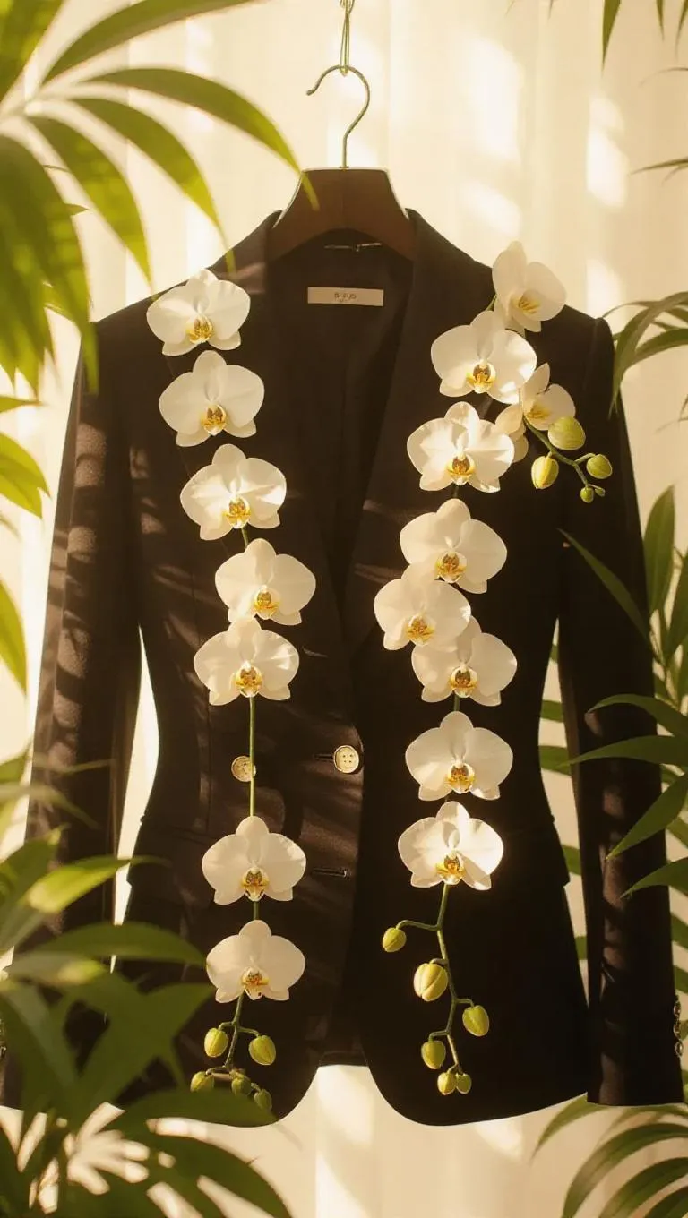 A chic blazer with delicate orchids blossoming along the lapels and buttons, creating a whimsical blend of modern style and natural beauty. The blazer hangs on a hanger, surrounded by soft, diffused sunlight filtering through leaves, enhancing the serene and magical atmosphere.