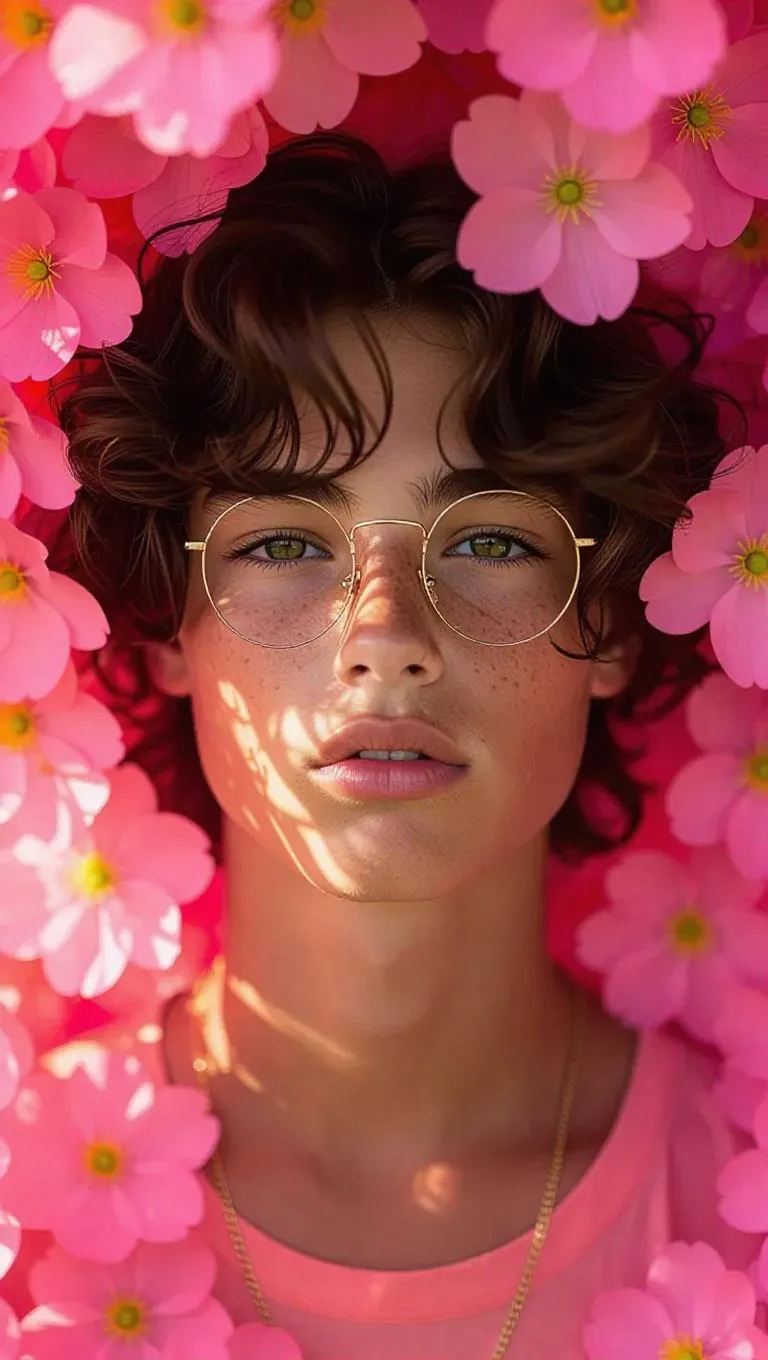 A serene portrait of a teenage boy crafted from delicate petals, enveloped in a radiant halo of bright pink and soft gold blossoms, set against a dynamic, energetic backdrop with energetic light, enhancing the lively and enchanting.