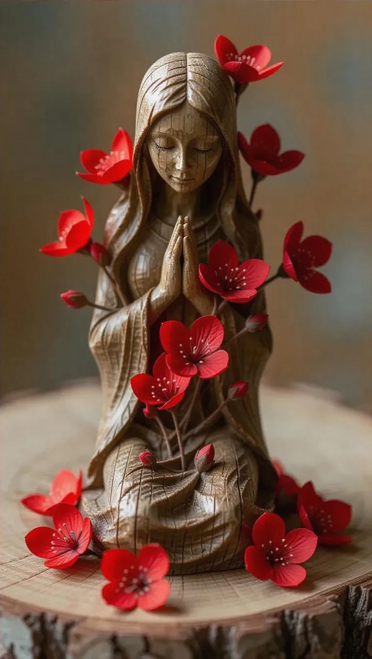 A melted wooden figurine with red flowers emerging from the cooled surface, symbolizing rebirth and renewal, the delicate petals contrasting with the hardened wood, creating a serene and poetic scene of life after destruction.