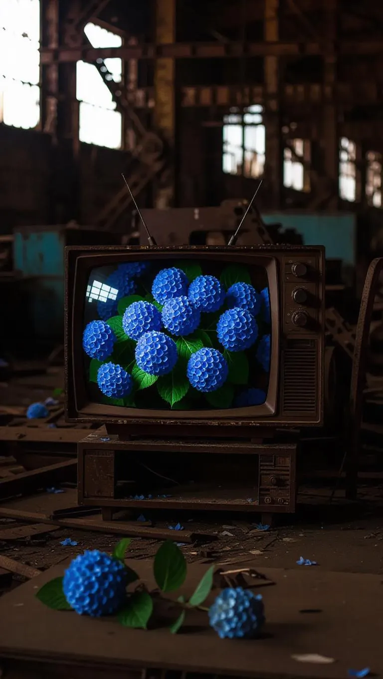 A broken television set nestled in an abandoned warehouse, its screen glowing faintly, blooming with deep blue hydrangeas, surrounded by rusty machinery and stark industrial shadows