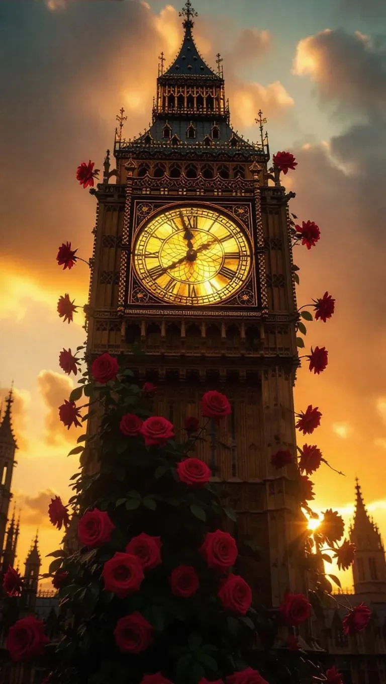 A majestic, aged clock tower, casting a brilliant golden light from its shattered face, entwined with vibrant roses that spiral around its structure and bloom from the sides, creating a whimsical, enchanted ambiance.