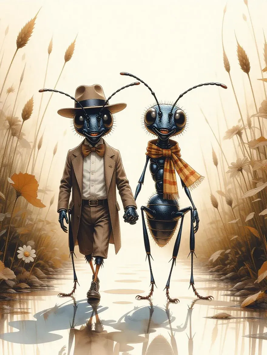 Create enchanting AI-generated art with vivago.ai's stylized watercolor effects. This whimsical anthropomorphic ant couple, dressed in chic accessories, strolls a serene path amidst ethereal chaos. Merging Willem Haenraets' vibrancy, Carne Griffiths' delicate watercolor splashes, and WLOP's cinematic flair for a dreamy fusion of romance and surreal beauty. Perfect for unique digital storytelling visuals.