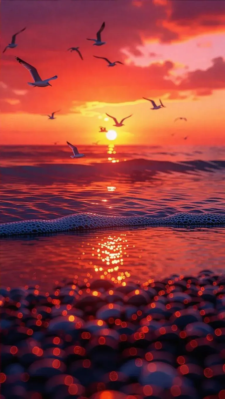 Create stunning AI-generated sunset wallpapers with vibrant orange-pink hues over calm oceans. Enjoy realistic wet sand textures, animated rolling waves, and gliding seagulls in ultra-detailed 8K resolution. Perfect for high-saturation, low-angle scenic visuals – transform prompts into dynamic AI art with VivaGo's professional image generation tools.