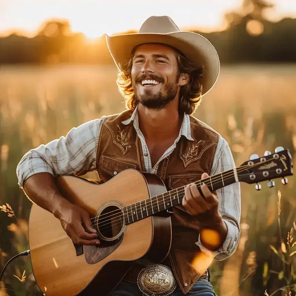 Generate a vibrant AI image of a cheerful country singer strumming an acoustic guitar in a sunlit field. Featuring a cowboy hat, detailed costume, round face, thick eyebrows, and hazel eyes, powered by Vivago.ai's advanced AI tools for high-definition, lifelike musical artistry.