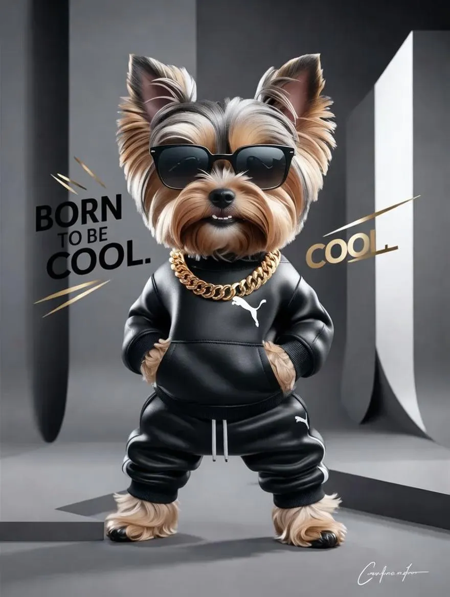 Generate a 3D AI image of a stylish Yorkie puppy in a trendy Puma sweatsuit, gold necklace, and black sunglasses, exuding confidence and urban charm. Bold "Born to be Cool" text complements the gray backdrop. Explore AI-generated fashion pet art with Vivago.ai’s creative tools for playful, high-quality visuals.