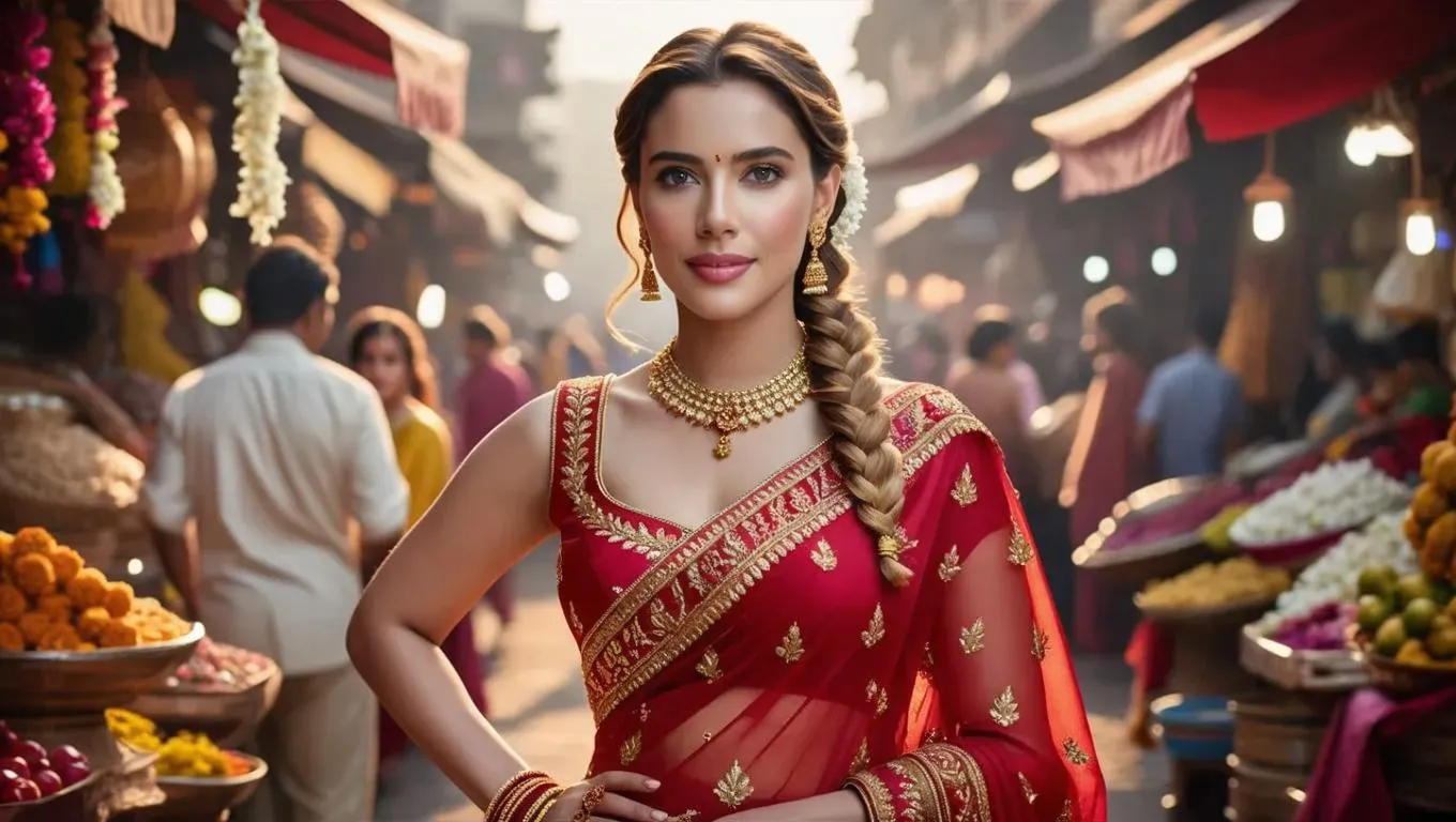 Create stunning AI-generated visuals of Scarlett Johansson in a vibrant red saree with vivago.ai. Transform text prompts into Bollywood-inspired elegance using advanced AI image tools for lifelike details, cultural fusion, and professional-grade artistry. Explore AI effects to enhance beauty, fabrics, and lighting in your creative projects.