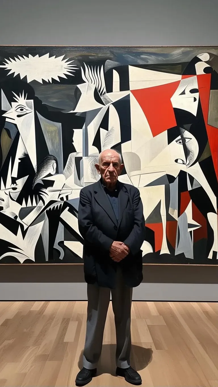 Generate hyper-realistic AI art of Pablo Picasso contemplating his iconic Guernica masterpiece, blending surrealism with lifelike detail. Explore AI-powered visual storytelling tools to create striking, imaginative portraits merging historical artistry with modern AI innovation.