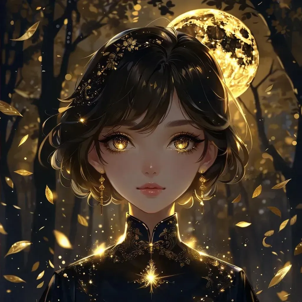 Generate a flamboyant, glowing anime character in a dark, gold-accented scene with moonlit trees and wind-blown leaves. Create stunning AI anime art using Vivago.ai's tools for vibrant visuals, luminous facial details, and dynamic environmental effects. Perfect for professional-grade fantasy-themed content.