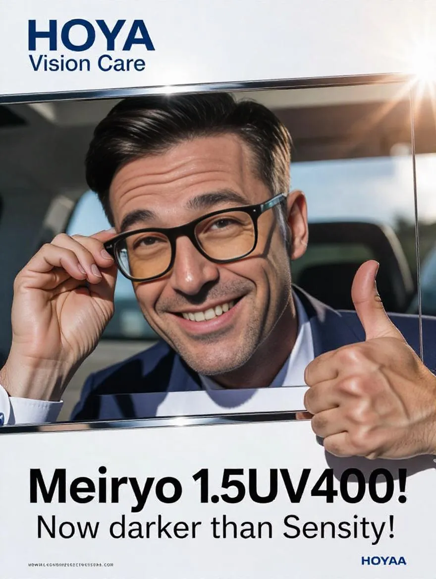 Create a photorealistic Hoya Vision Care ad showcasing Meiryo 1.5UV400 lenses with yellowish tint under sunlight. Features a smiling man in glasses peeking sideways, giving thumbs-up. Bold slogan “Meiryo 1.5UV400! Now darker than Sensity!” highlights UV400 protection and enhanced tint. Clean, high-tech design emphasizes premium ophthalmic lens innovation for optimal visual clarity.